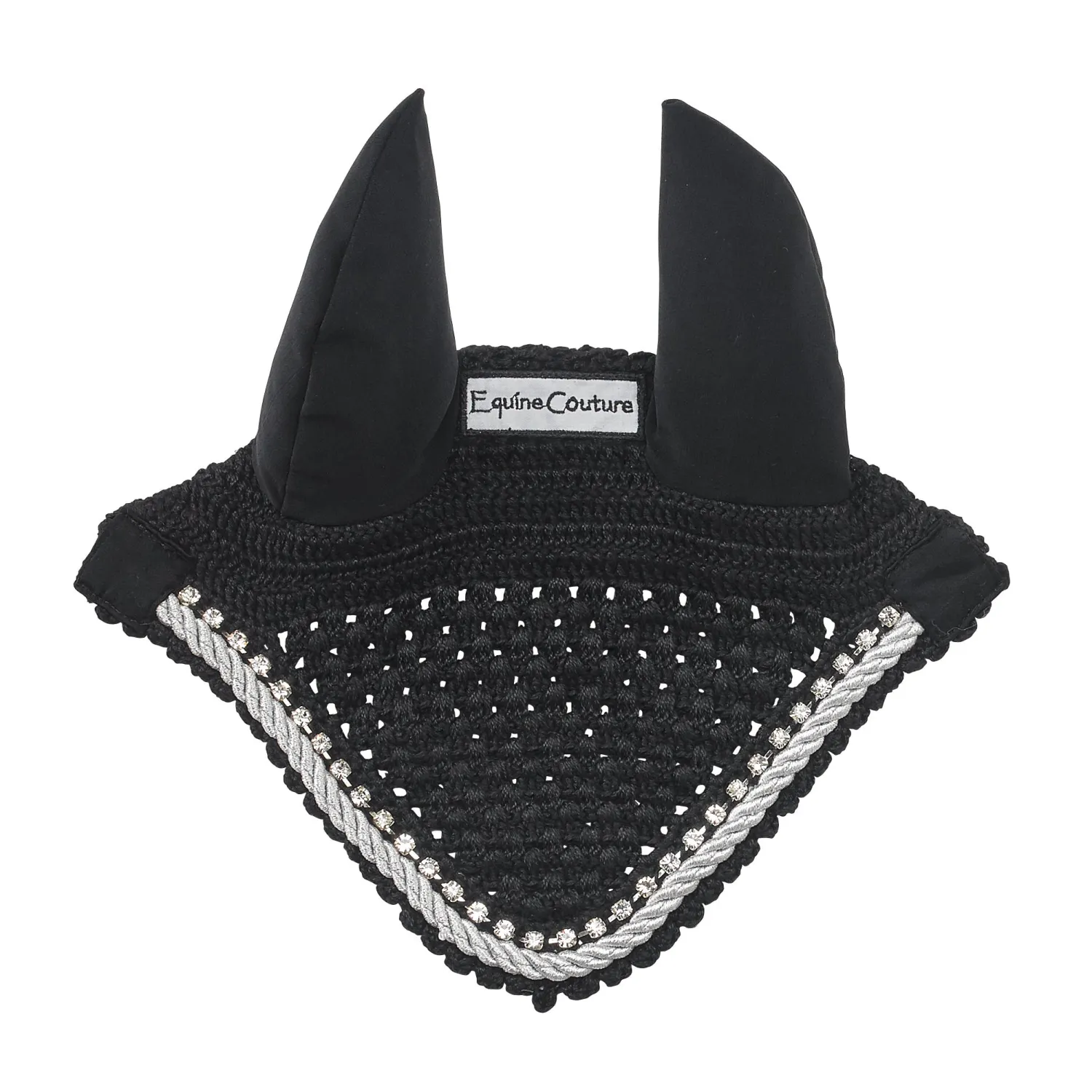 The Equine Couture™ Fly bonnet with Piping & Crystals eliminates your horse’s worry about flies in his ears. Made of comfortable, breathable cotton, this ear net offers a hint of bling with silver rope piping and a crystal border.
