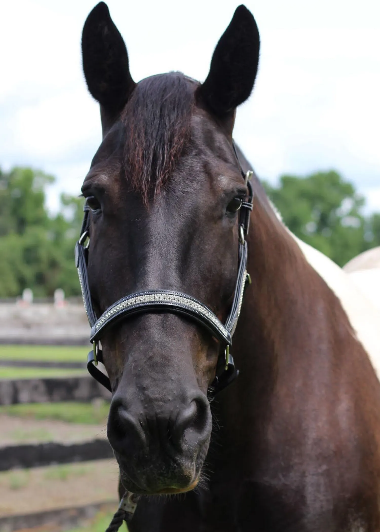 The Padded Jewel Halter by Henri de Rivel shows off your sense of fashionable style. Made of soft, high-quality leather, this eye-catching halter features three rows of crystals on the nose and cheeks accented by patent leather piping. Luxuriously padded for horse comfort, it has a two-buckle crown, adjustable chin and rolled throat with snap closure. Fitted with long-wearing stainless steel hardware throughout.