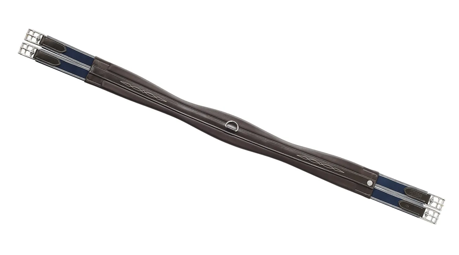 Triple-layer navy and white elastic ends and stainless steel roller buckles allow easy tightening. Subtle raised, fancy-stitch detail and petite branded metal plaques lend extra appeal. A soft, high-density foam on the inside provides cushioning and helps prevent pinching. Center D-ring provides versatility.