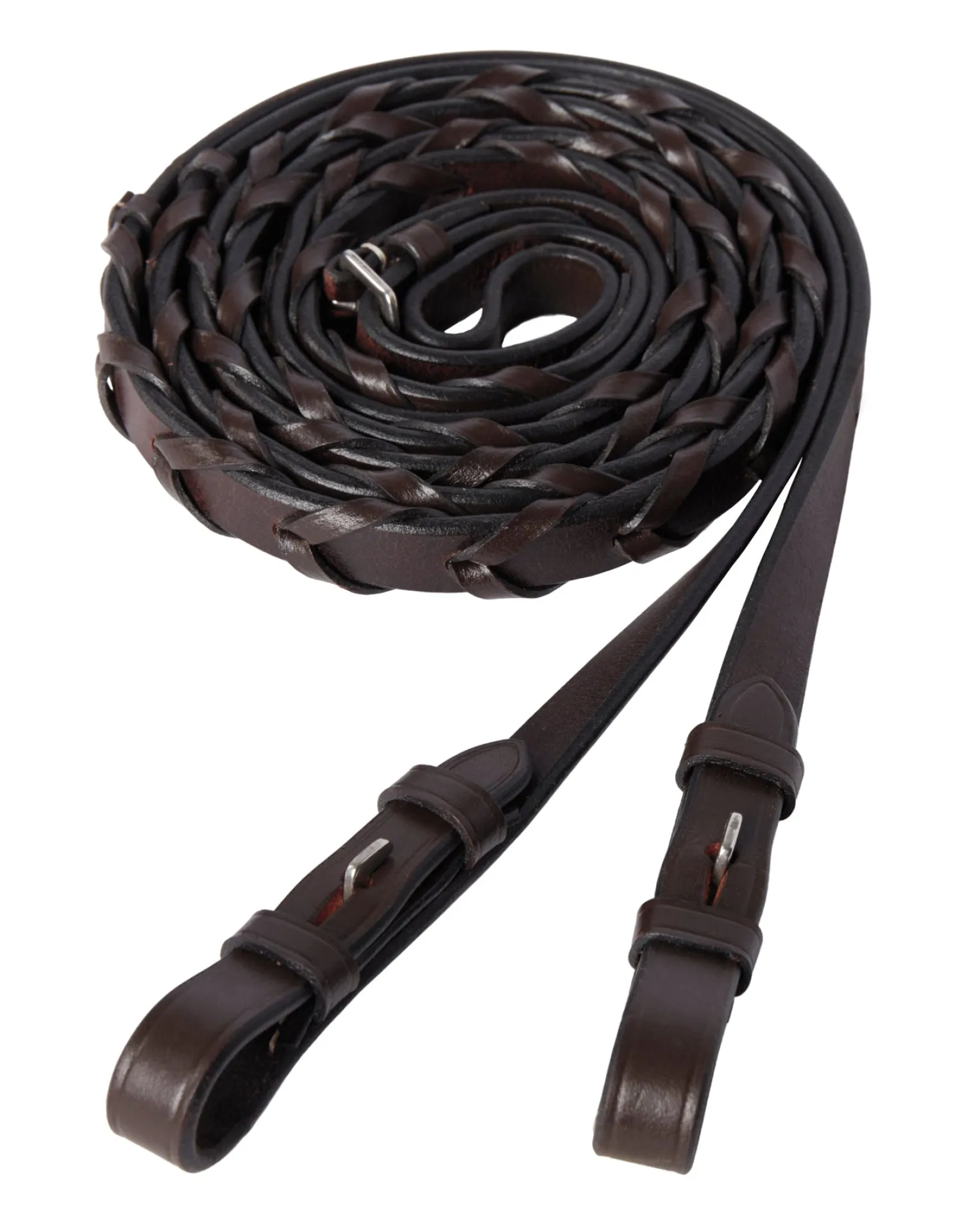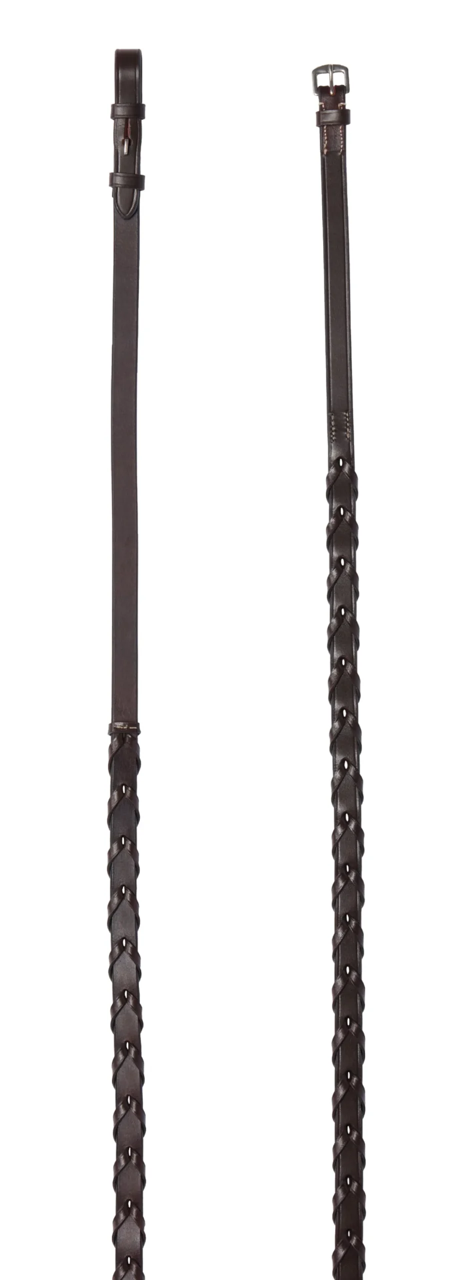 Part of the TRU-Fit™ Bridlework Collection, these Build-A-Bridle™ Laced Reins are a perfect way to complete your custom-fit bridle—or any bridle. The traditional braid offers substantial grip, while the classic hook stud closures present a clean look. Made of chocolate leather to complement most jump and all-purpose saddles.