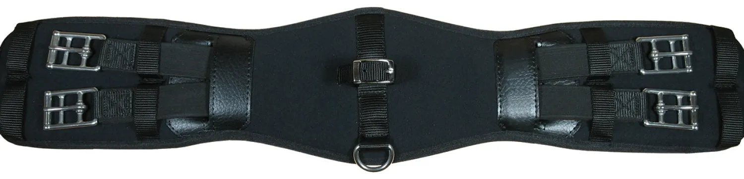A durable synthetic girth, it features European styling and quality craftsmanship, including stainless steel roller buckles. Elastic ends on both sides ensure stability. Center d-ring allows attachment of auxiliary equipment.