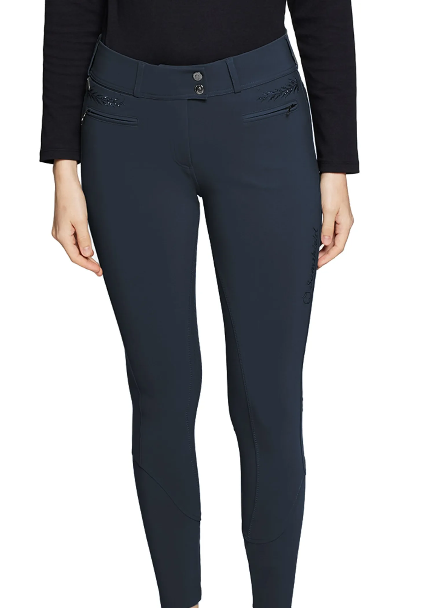 The Samshield® Ladies’ Capucine Full-Seat Breech provides minimalist equestrian styling with Swarovski® crystal detailing. High-rise with floral designs and Swarovski crystals on the back, thigh and above the two front zip pockets, these breeches combine elegance and performance for all disciplines. Breathable and stretchy fabric is designed in an eco-responsible way to last over time with anti-pilling, wrinkle-resistant finish. Two zip pockets on front, invisible zip pone pocket and two pockets on the back. Compressive material on the calves for better blood circulation. UPF 50 protection.