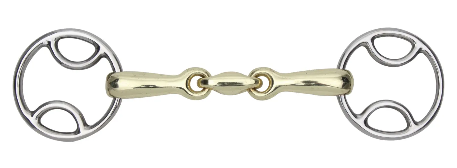 Shires Beval Bit with Lozenge allows mild leverage. A brass alloy mouthpiece aids salivation. Gentle rounded lozenge prevents the nutcracker effect of a single-joint bit. Mouthpiece thickness is 16mm; cheek height is 55mm (5″), 70mm (5.5″).
