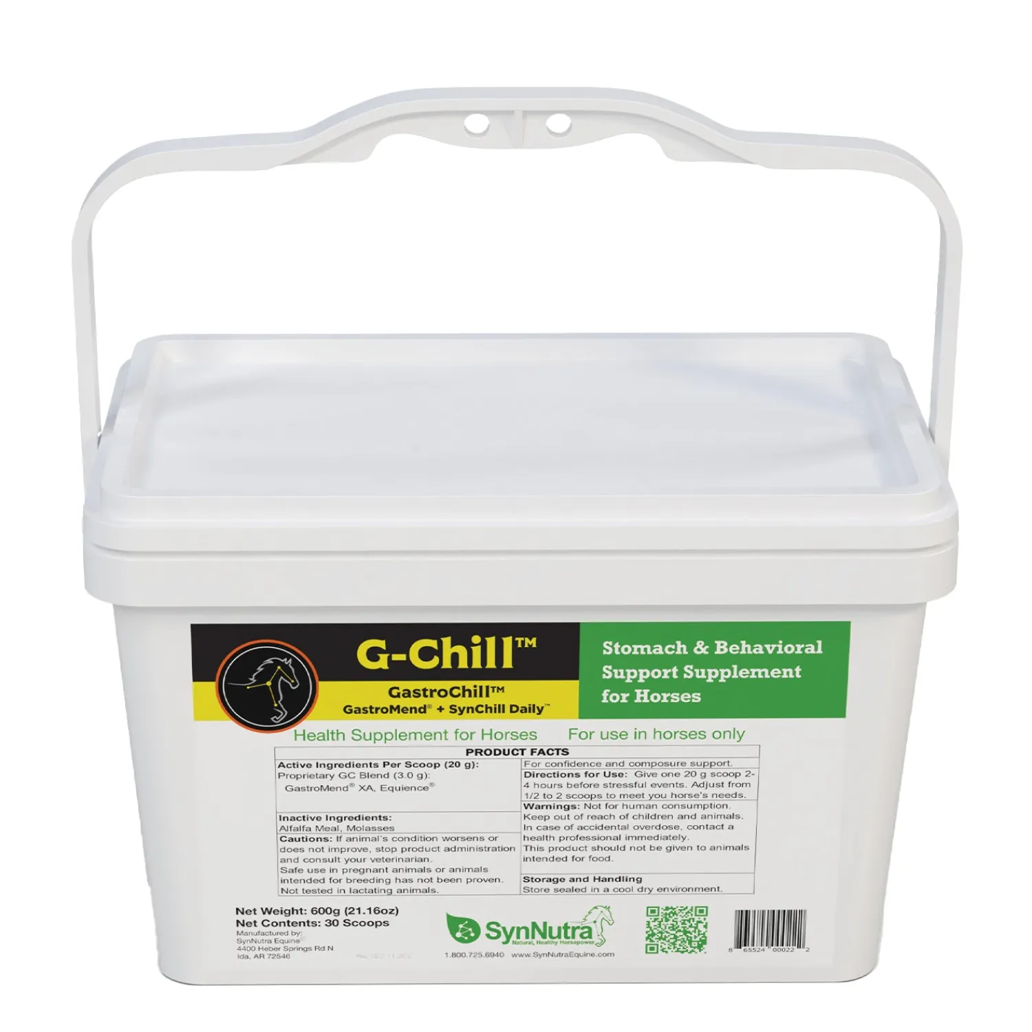 G-Chill™ pellets contain the same natural, ingredients for composure support you’ll find in SynChill Daily™, plus the high-potency plant extracts and vitamins that make up GastroMend®, the revolutionary equine stomach health supplement from SynNutra.
