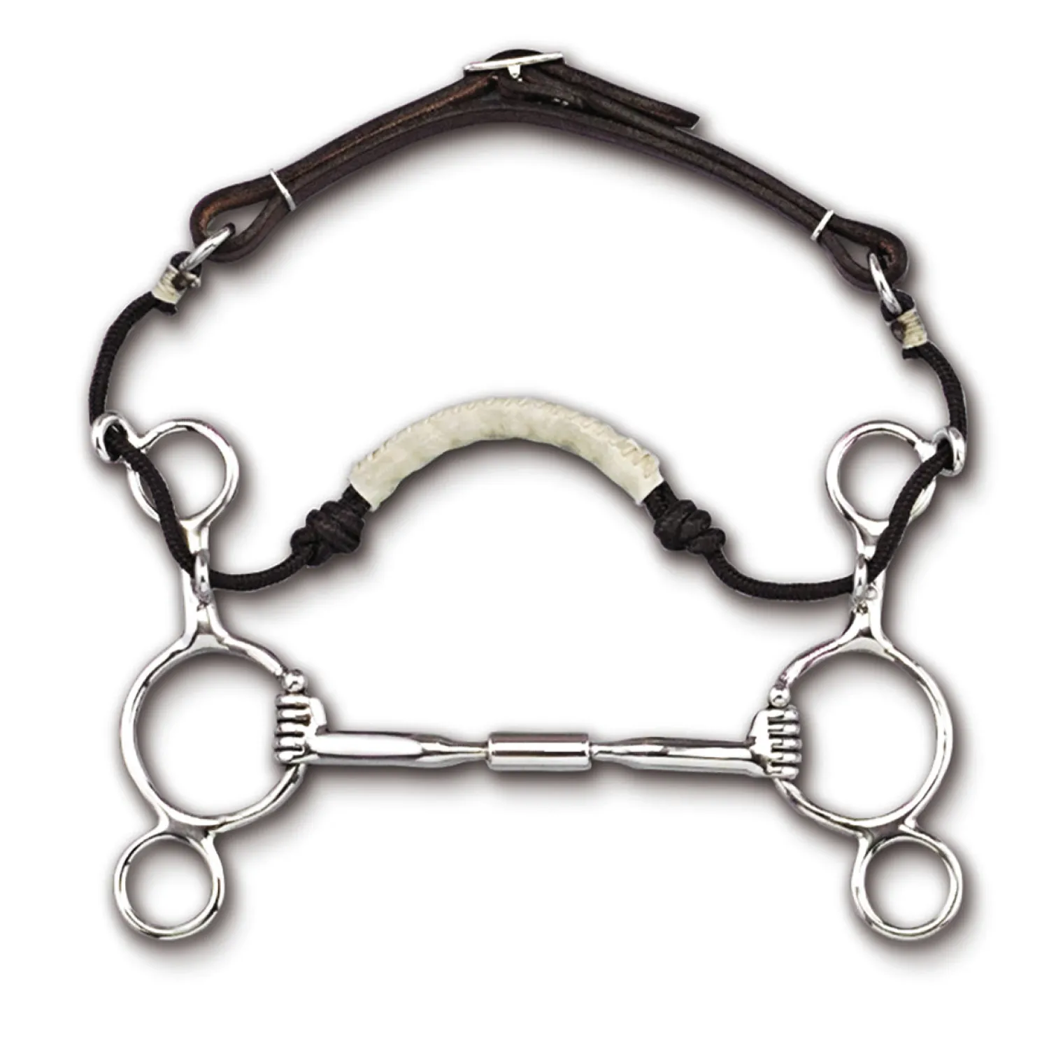 The 6″ stainless steel 2-ring combination bit is a hybrid of a ring bit, shank bit, and hackamore and uses five different pressure points to disperse rein pressure. Because the noseband and chin strap are connected through the purchase, when the reins are engaged, the horse first feels nose, chin and poll pressure before he feels the mouthpiece.