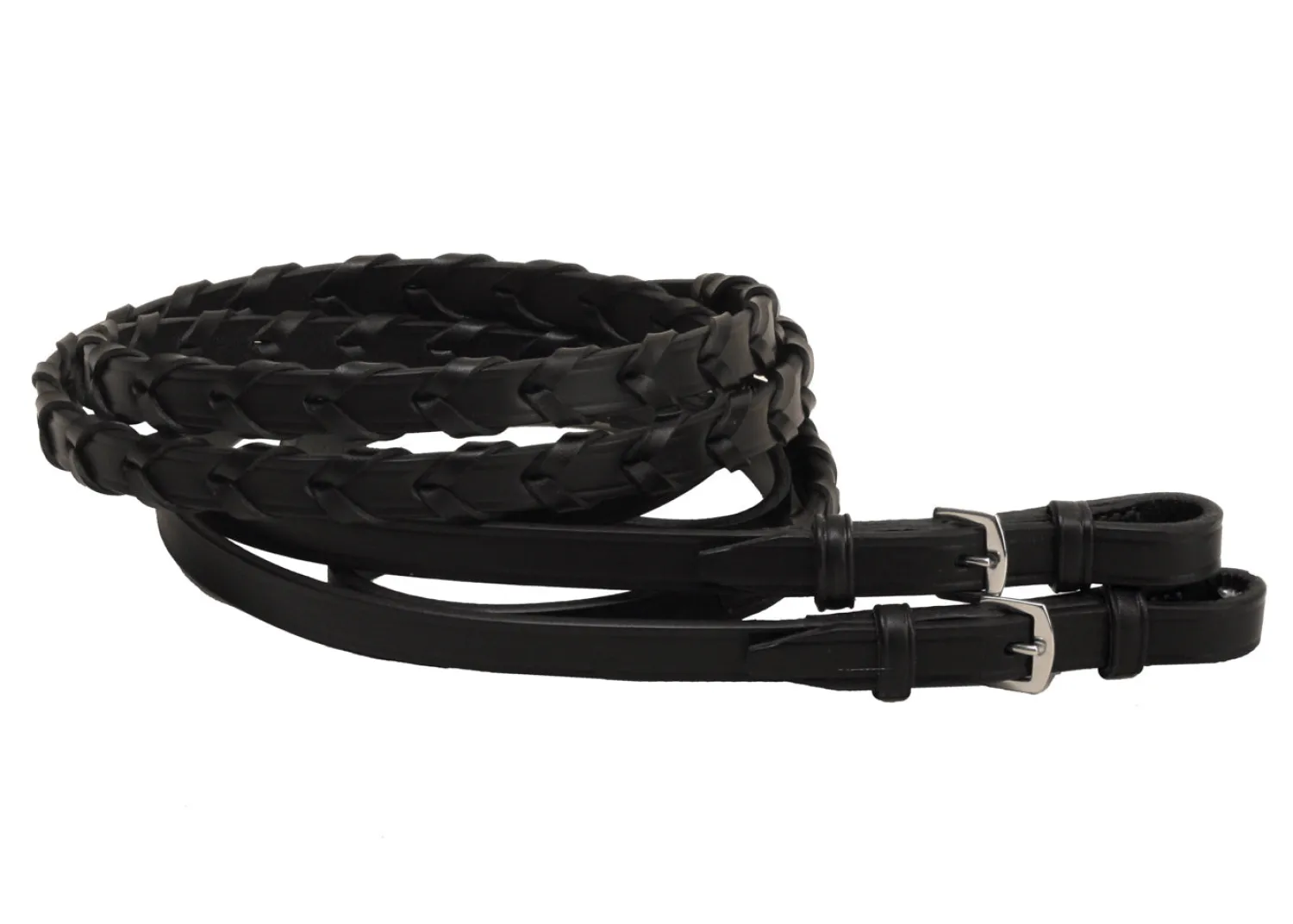 These Tory 5/8″ x 60″ Laced Reins have stainless steel buckle bit ends and a center buckle. Traditional lacing.