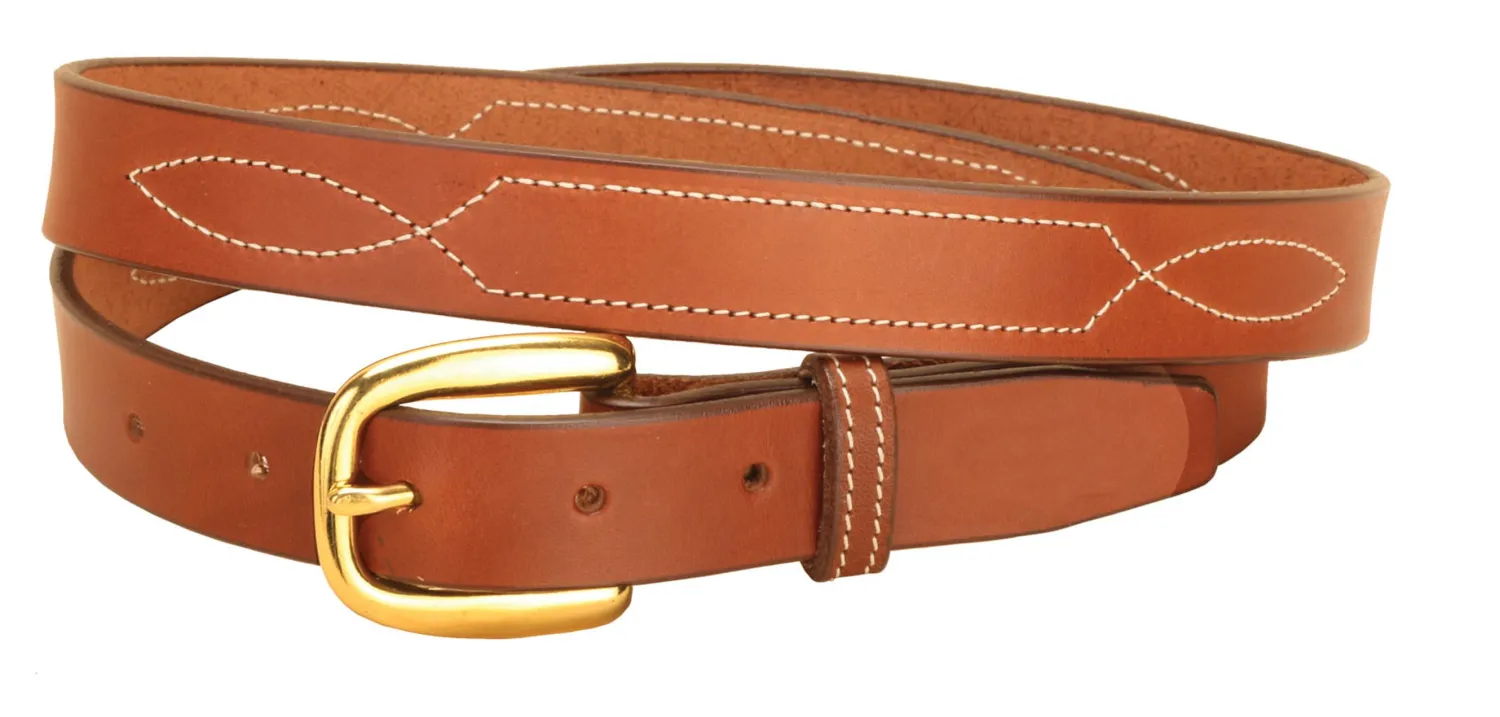 You can wear the name of a favorite horse or pet when you wear this handsome Tory Leather Stitched Pattern Belt. Beautifully crafted of supple, 1″ wide bridle leather, it features a stitch pattern with space for your own engraved nameplate. Finished with a sewn-on D-ring brass buckle and stitched leather keeper.