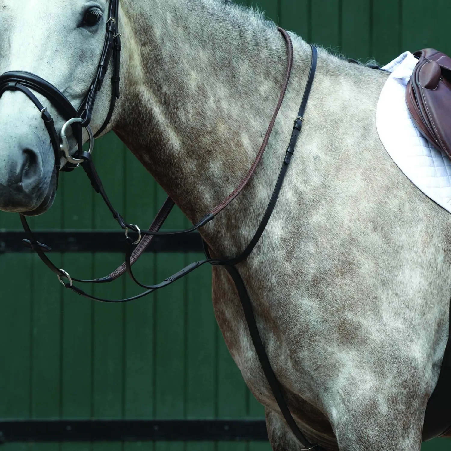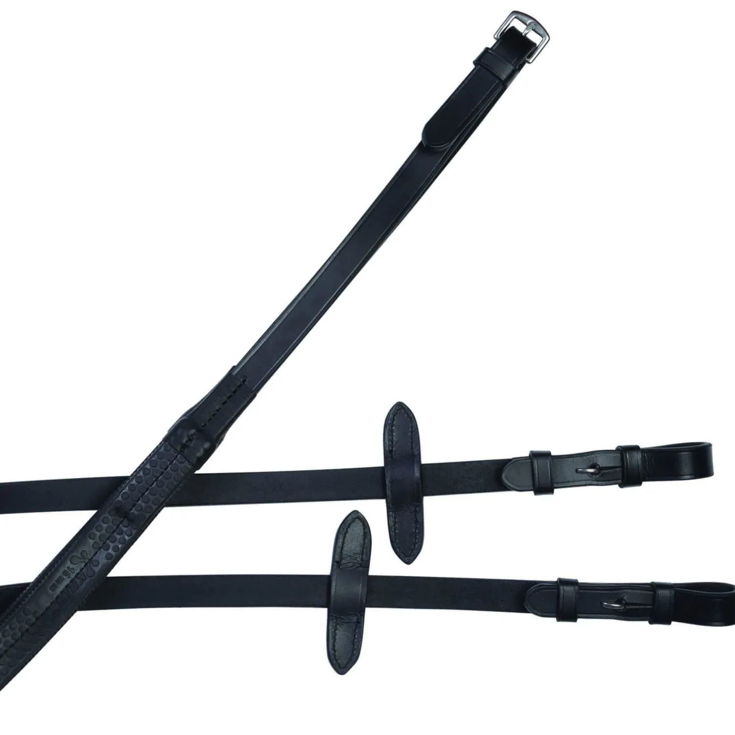 Collegiate® Essential Rubber Reins have traditional leather fronts and pebbled leather grips. Durable and secure hook stud closures.