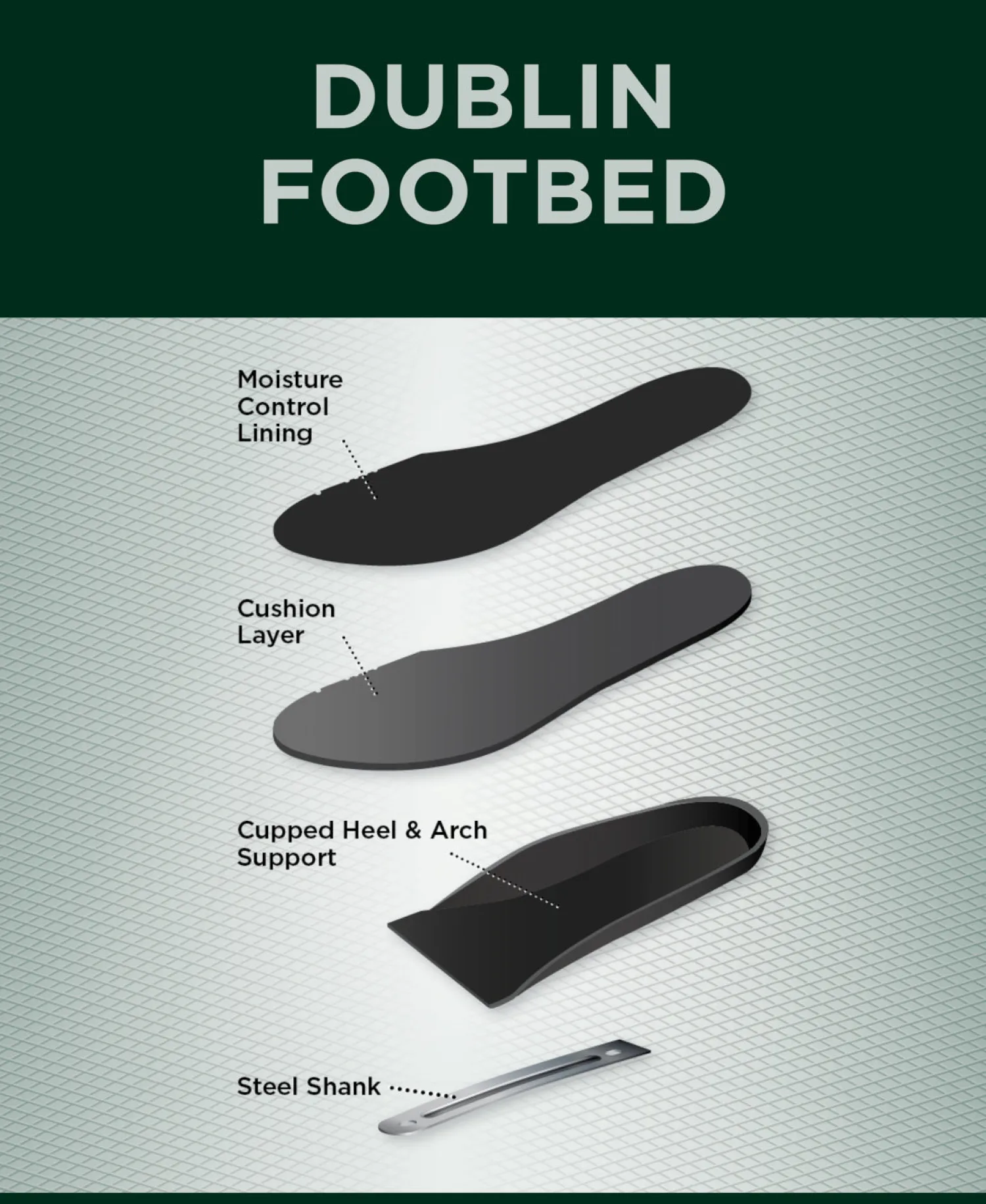 - Dublin footbed with EVA cradle offers comfort and moisture control.