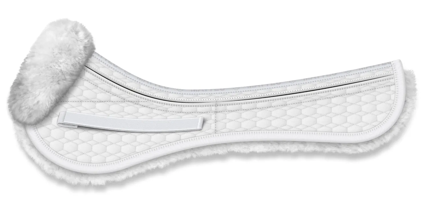 The latest design from E.A. Mattes: the Platinum EWWA Sheepskin All-Purpose Correction Half Pad. Designed specifically for high-withered horses, it has an extra-wide wither area. It helps reduce or eliminate pressure in the wither area and supports a proper saddle fit. The EWWA Pad maintains the patented Spine Free® design, with the channel opening lower on the wither.